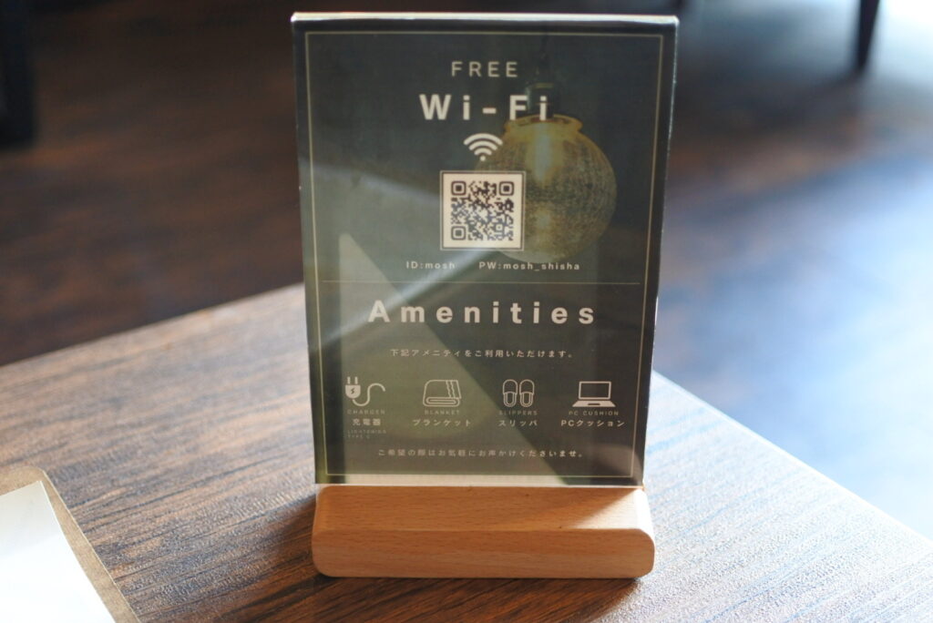 今回訪れたMOSH流山おおたかの森店では、Free Wi-Fiが利用できるとのこと。早速登録をして快適なネットワークを確保しました。また、冬場で少し肌寒く感じたのですが、ブランケットやスリッパなどもアメニティとしてレンタルしているとのことで、利用させてもらいました。