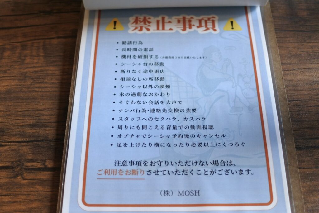 などは、多くのシーシャカフェで共通の禁止事項とのことなので、今後もシーシャカフェを訪れる際は気をつけながらシーシャを楽しみたいと思います。