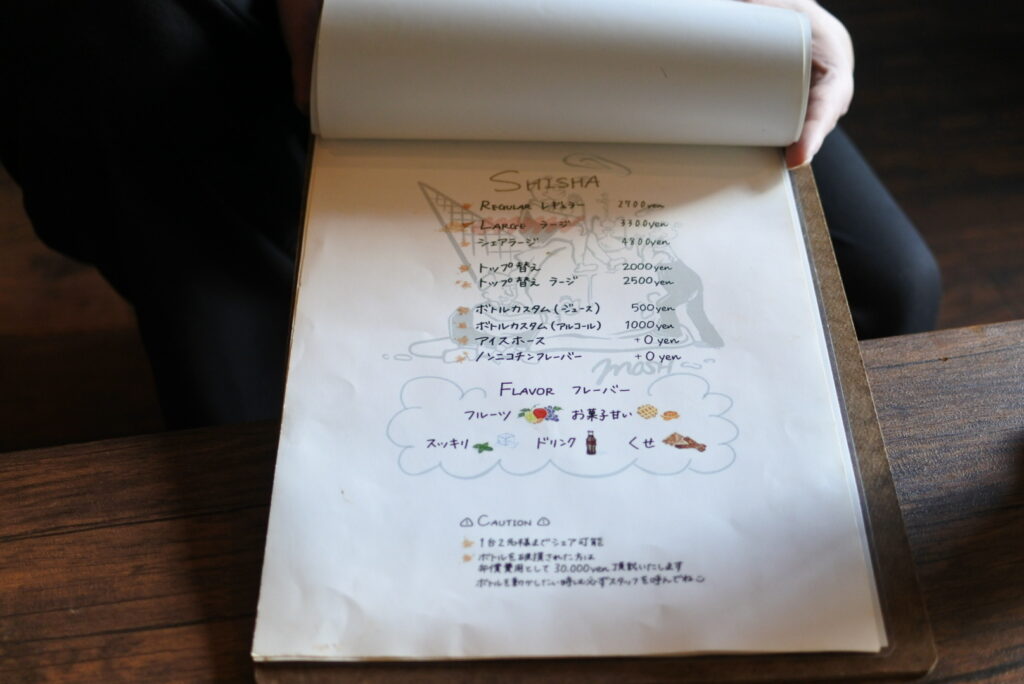 オーダーした後、シーシャが出来上がるまで15〜20分ほど待ち時間が発生します。多くの場合、オーダーしたドリンクが先に到着するので、ドリンクを飲みながらシーシャを楽しみに待ちましょう。シーシャが出来上がるまではどうしても多少時間がかかってしまうので、メニュー表の他のページを詳しく見たり、店内のインテリアを眺めたり、またお店のアメニティや貸し出しグッズをチェックしても良いでしょう。