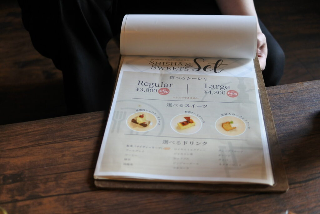 席に着くと、スタッフさんから料金システムとメニューの案内があります。スイーツにも特化しているMOSH流山おおたかの森店では、シーシャ・スイーツ・ドリンクのお得なセットも提供しているようです。シーシャカフェによって、ドリンク飲み放題コースがあったり、チャージ料金があったりと異なるので、ぜひ予算をみながら満喫できるコースを選んでみてください。今回はシンプルにシーシャとワンドリンクをオーダーしました。