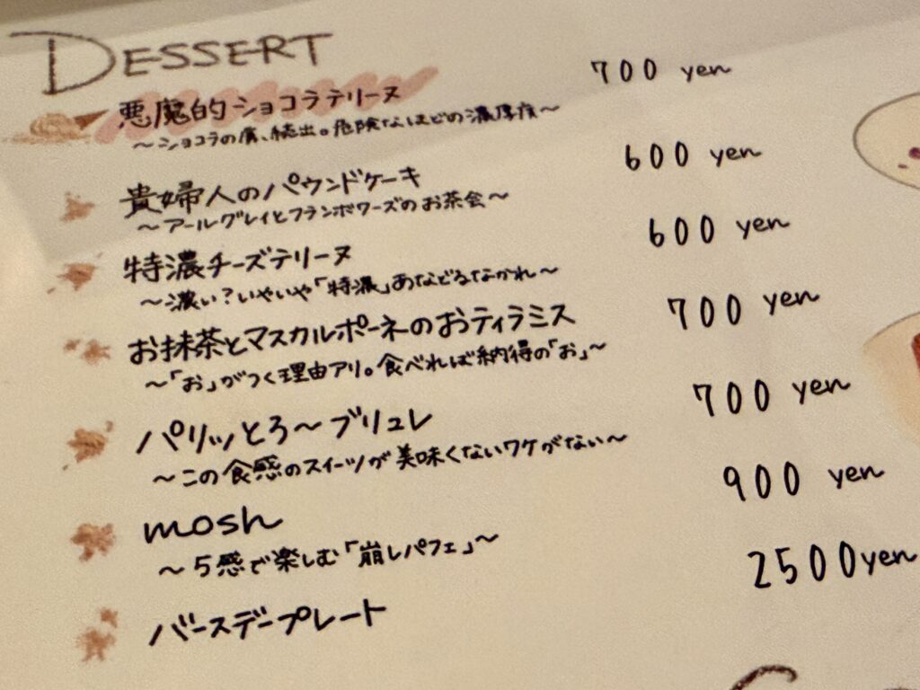 実は先日、非常に個人的なことではありますが、誕生日を迎えた筆者。せっかくなら記念すべき1日を大好きなMOSH流山おおたかの森店で過ごしたい!と思い、事前に連れ合いとの予約をしたのですが、その時ふと頭をよぎったのが、MOSH流山おおたかの森店のメニュー表デザートページにある「バースデープレート(2,500円)」。
