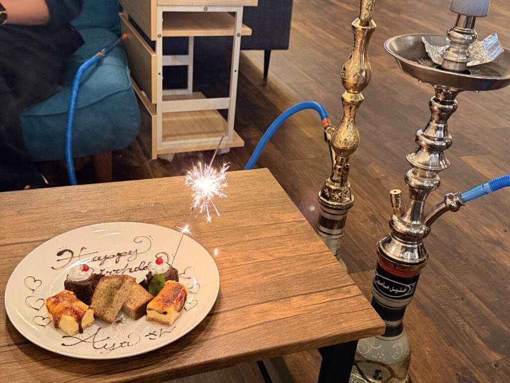 シーシャを吸っているところに、スタッフさんが頃合いを見計らって持ってきてくださったのが、こちらのバースデープレート!筆者はこれまで見たことがなかったのですが、いざ対面してみると想像以上に豪華でテンションがあがります!!きれいな花火の演出に、美しくお皿に描かれたハッピーバースデーの文字。普段は1種類しか食べることのないデザートが豪華に3種類盛り合わせになっていました。