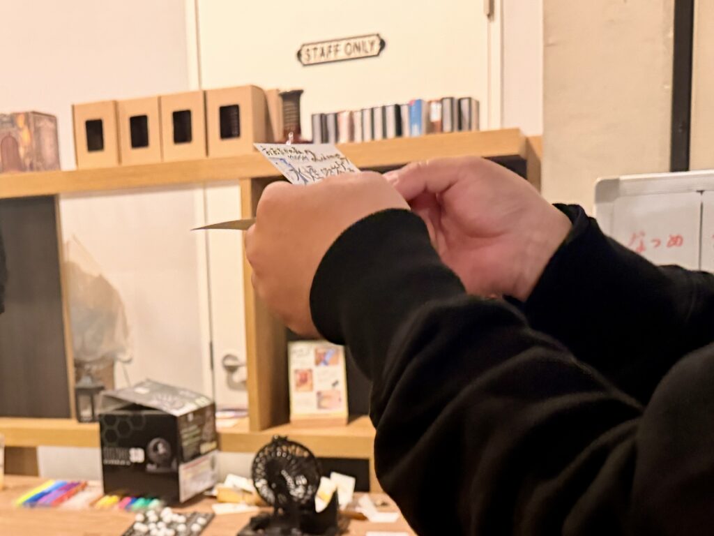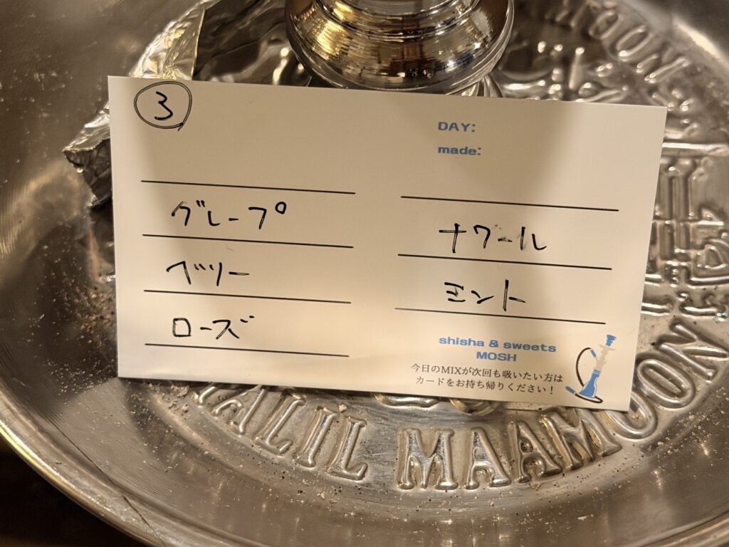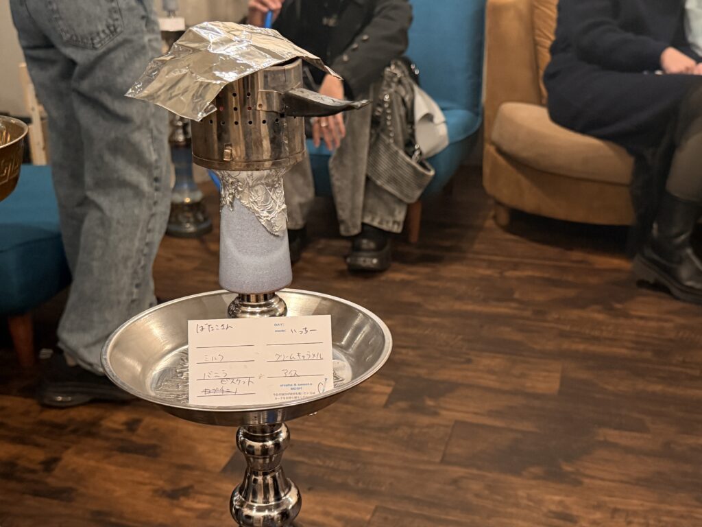 先ほどいっちーさんにお願いしたシーシャが、蒸らしの状態で運ばれてきました。もうすぐ出来上がりそうです!ミックスカードに書かれたフレーバーは「ミルク×バニラ×ビスケット×クリームキャラメル×アイス」。筆者の好みを完全に把握されていて、脱帽です(早く吸いたい……)。